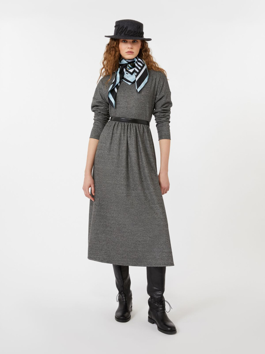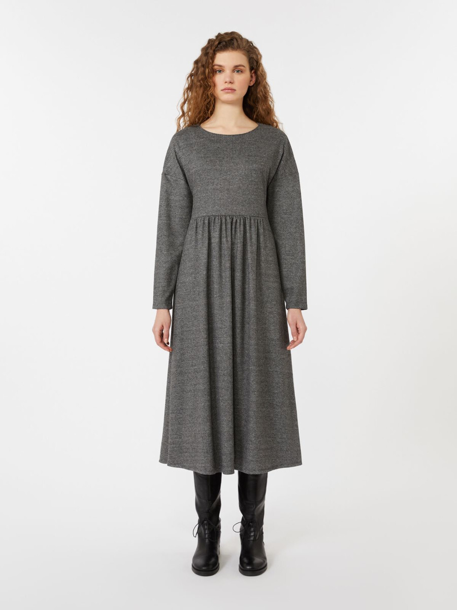 Abito lungo in jersey con scollo rotondo, maniche lunghe e vita con pinces. Il capo, ampio e dalla vestibilità comoda, presenta un dettaglio arricciato che dona movimento sul davanti e sul retro della gonna.