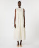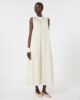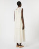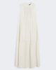 Abito lungo con balza sull’orlo e dettaglio arricciato che definisce la silhouette.