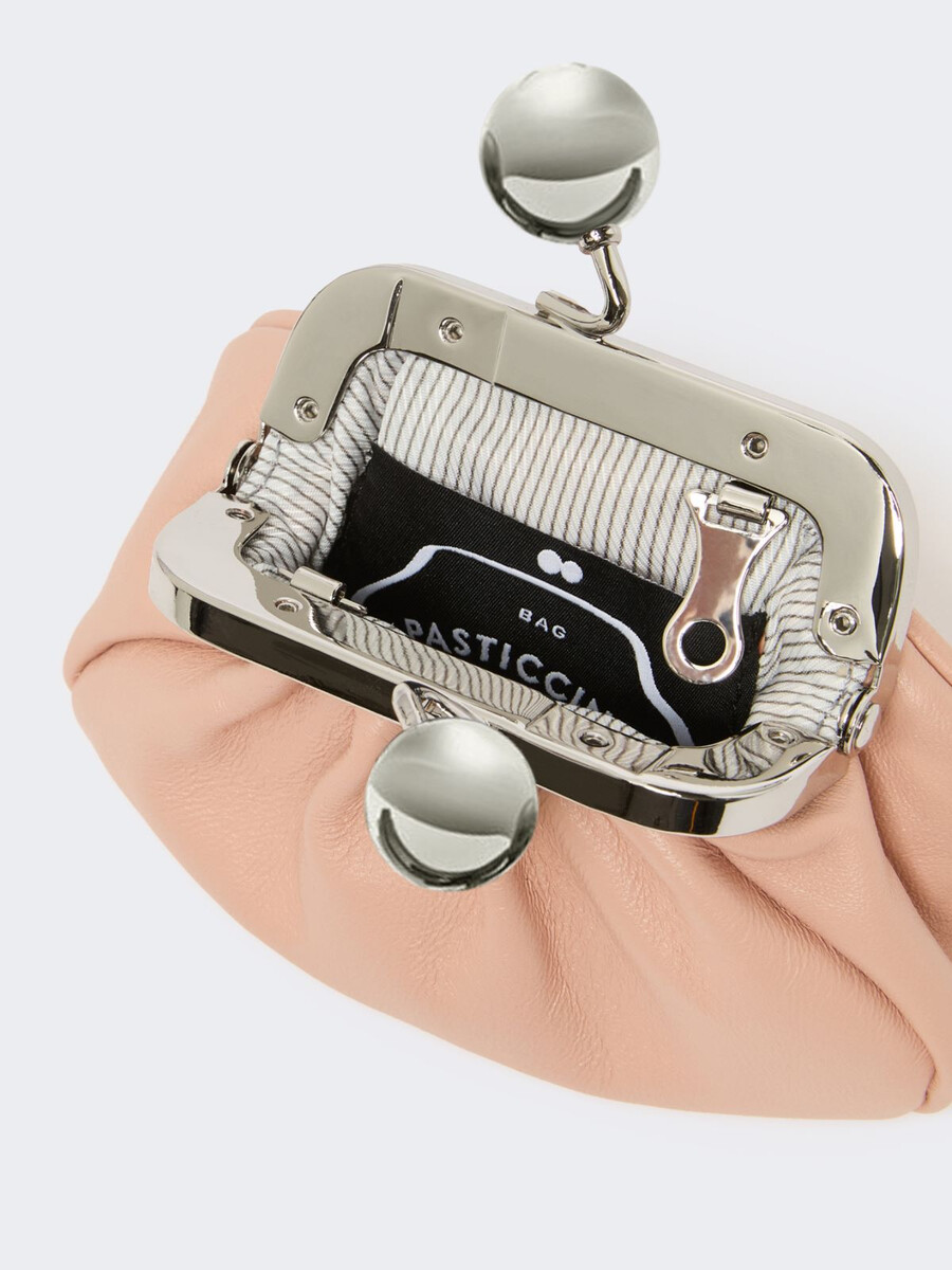 Mini Pasticcino Bag con chiusura a moschettone sul retro per agganciarla facilmente alle borse Weekend Max Mara. Completa di due tracolle, una lunga e una corta, entrambe removibili con chiusura a moschettone.