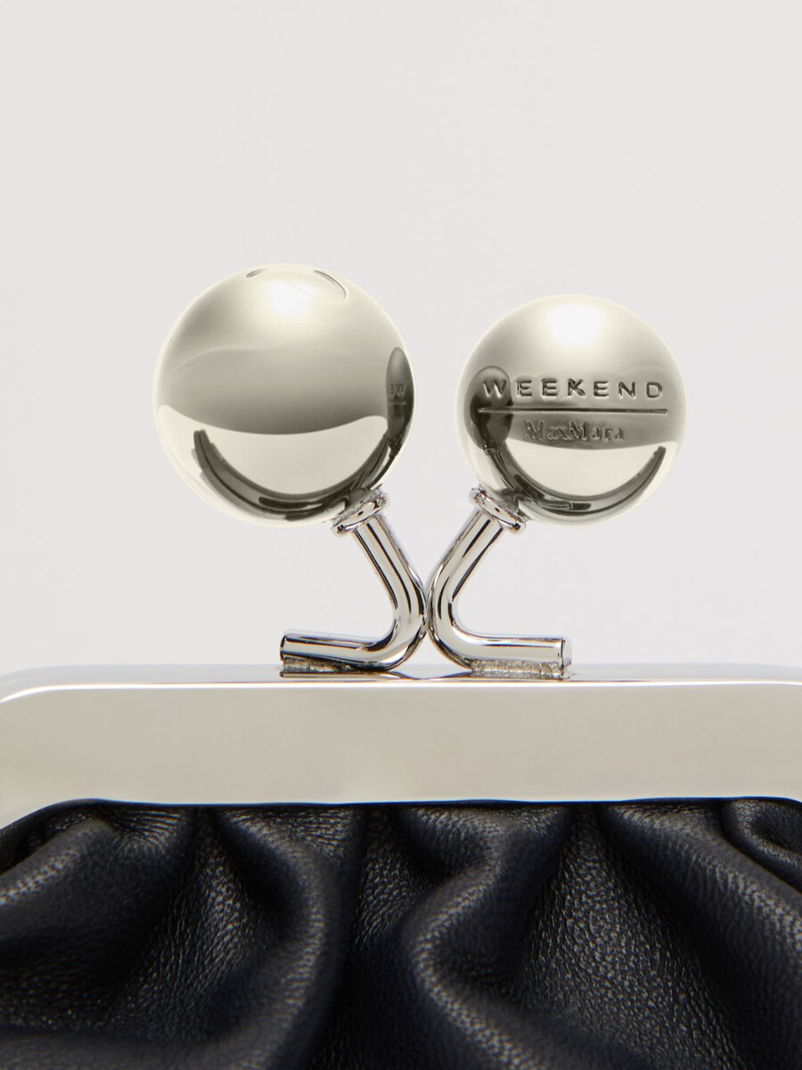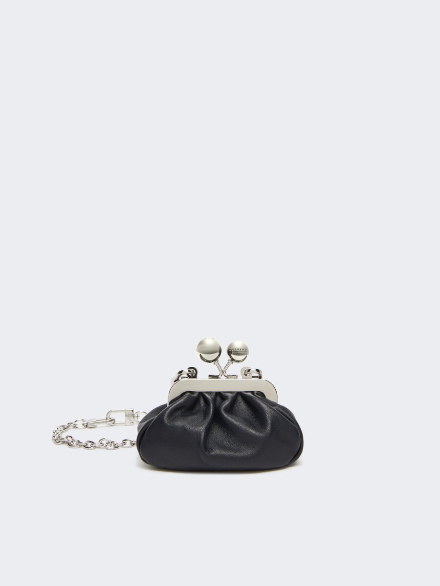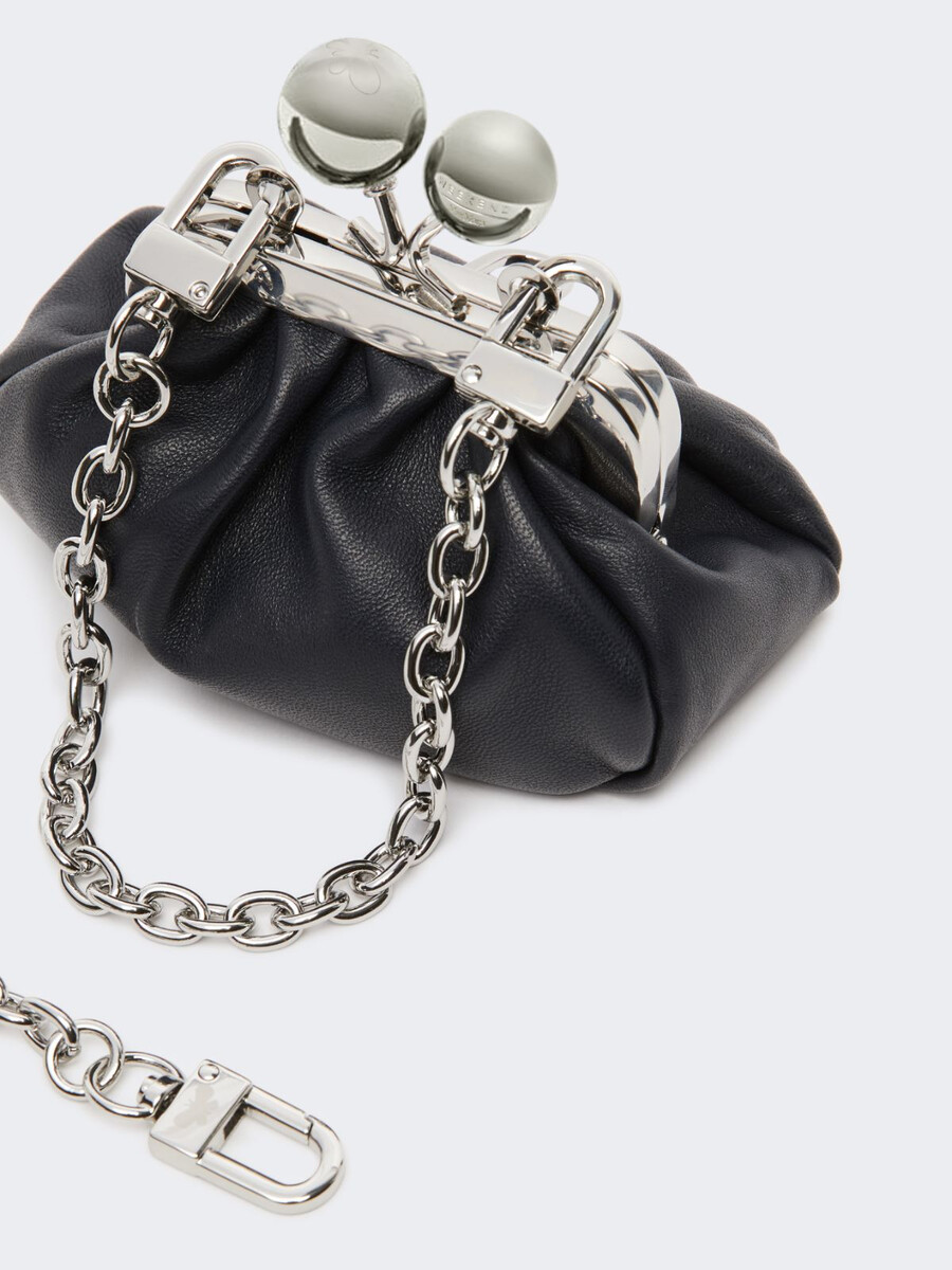 Mini Pasticcino Bag con chiusura a moschettone sul retro per agganciarla facilmente alle borse Weekend Max Mara. Completa di due tracolle, una lunga e una corta, entrambe removibili con chiusura a moschettone.