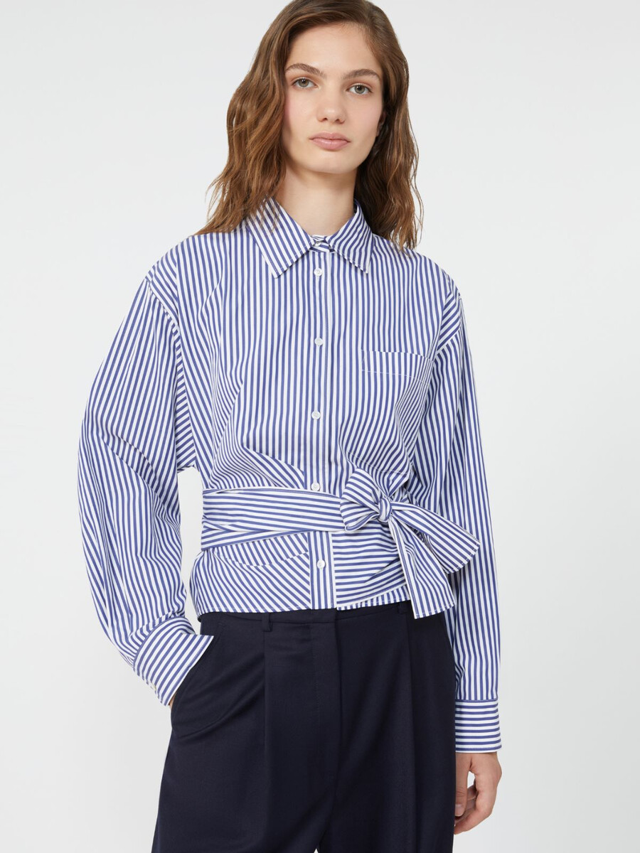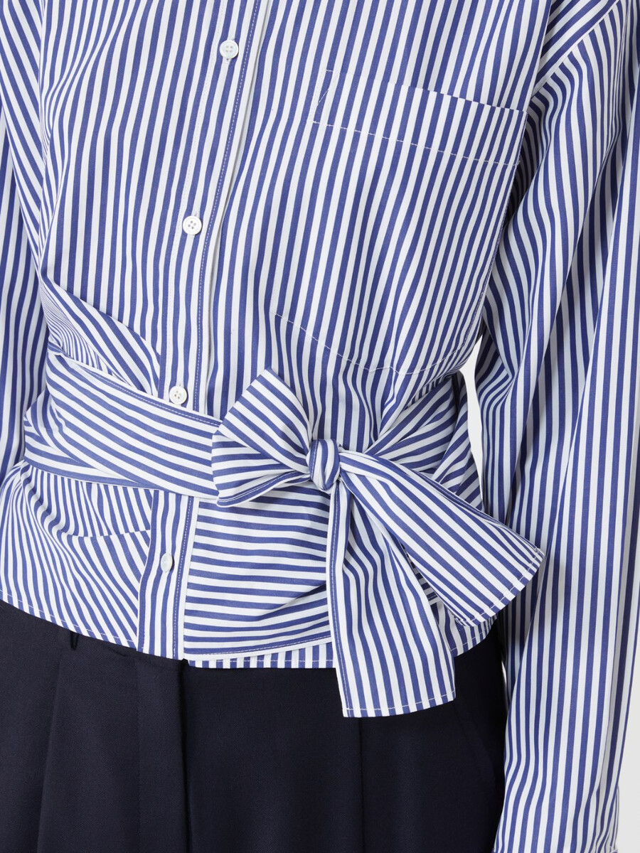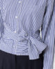 Camicia dalla silhouette femminile con motivo drappeggiato sul davanti e fascia alta da annodare in vita.