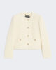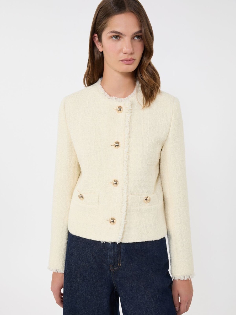 Giacca monopetto corta con una particolare texture leggermente goffrata e finiture con frange.