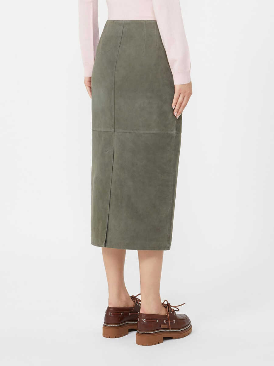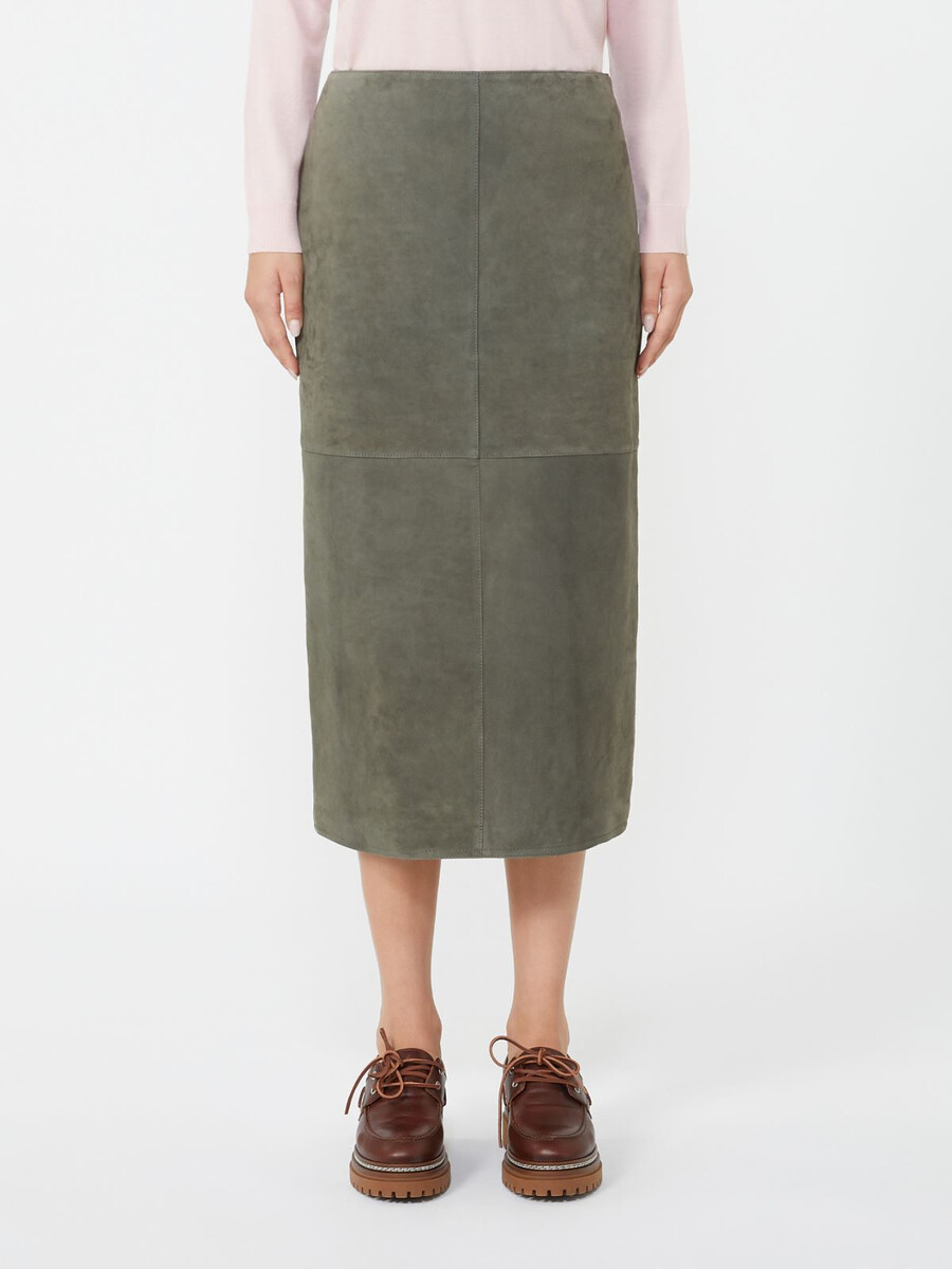 Gonna midi dalla silhouette dritta, rifinita con cuciture e impunture effetto pelle.