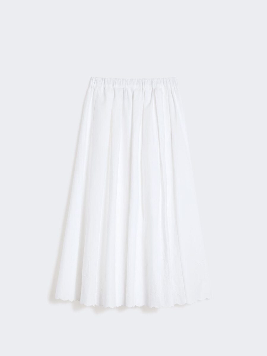 Gonna lunga a trapezio, impreziosita da ricami a occhiello sull’orlo e bordo smerlato.