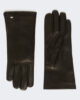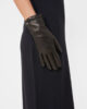 Guanti corti personalizzati con piccolo logo a farfalla in metallo applicato sul polso.