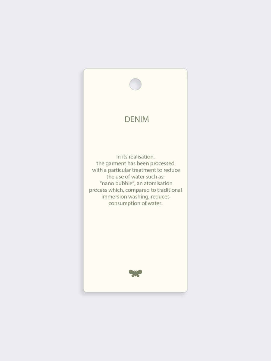 Pantaloni in denim di cotone ispirati al modello 5 tasche. Il capo vanta una texture dal look autentico e una vestibilità dritta in stile anni ’90, oltre a rivetti in metallo, dettagli in gros grain e logo a farfalla sulla tasca posteriore. Chiusura frontale.