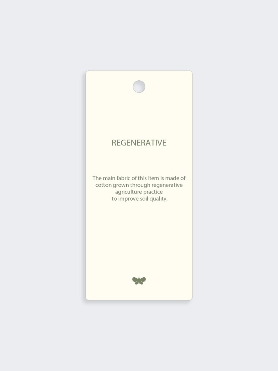 - Tessuto principale con fibre di cotone coltivate attraverso pratiche di agricoltura rigenerativa