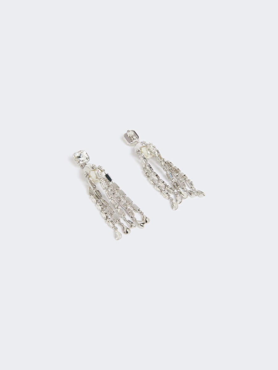 Orecchini pendenti in metallo impreziositi da nappe e strass.