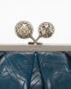 • Chiusura iconica a pochette con pompon metallici incisi