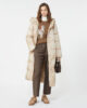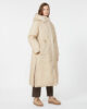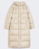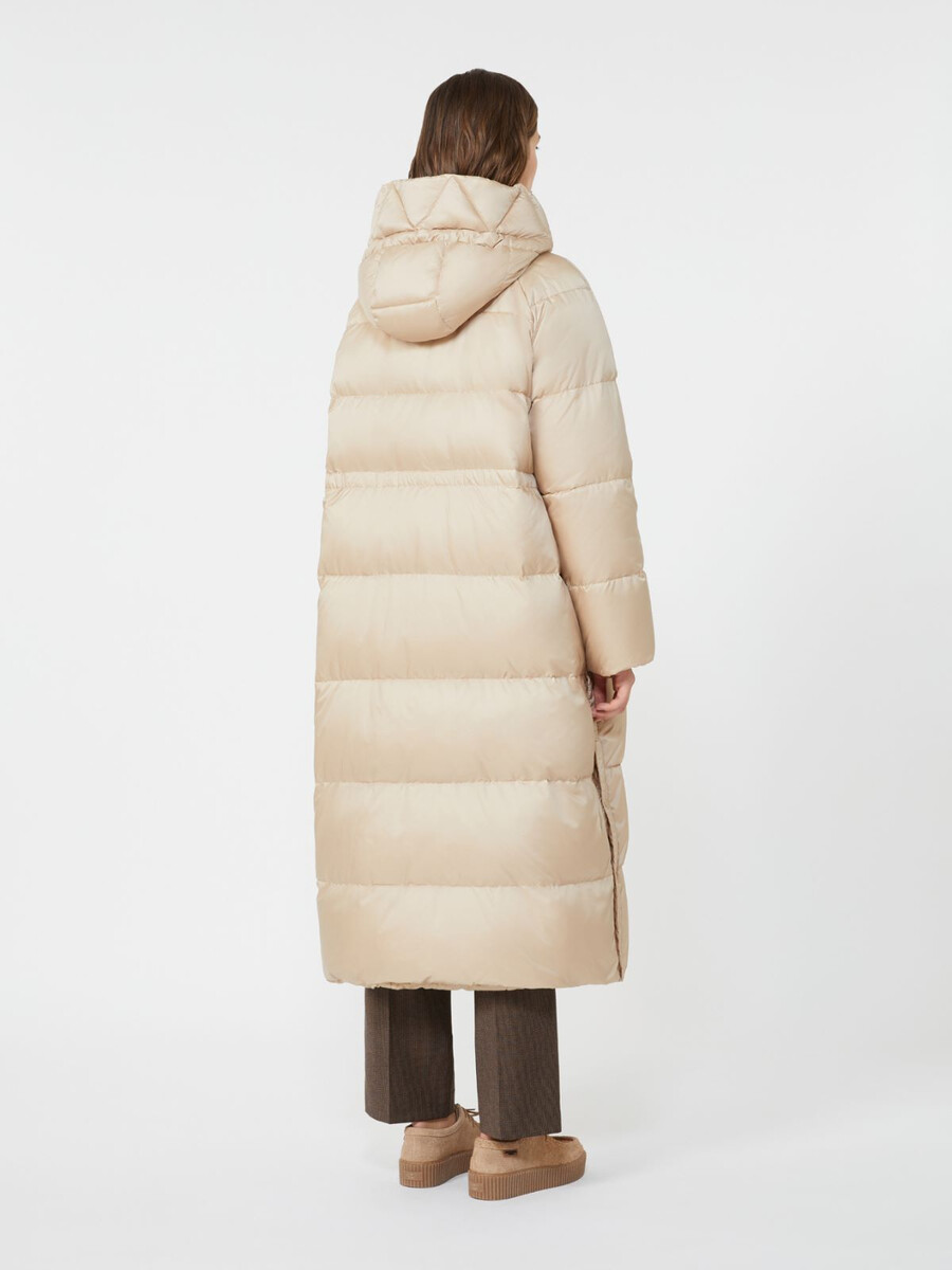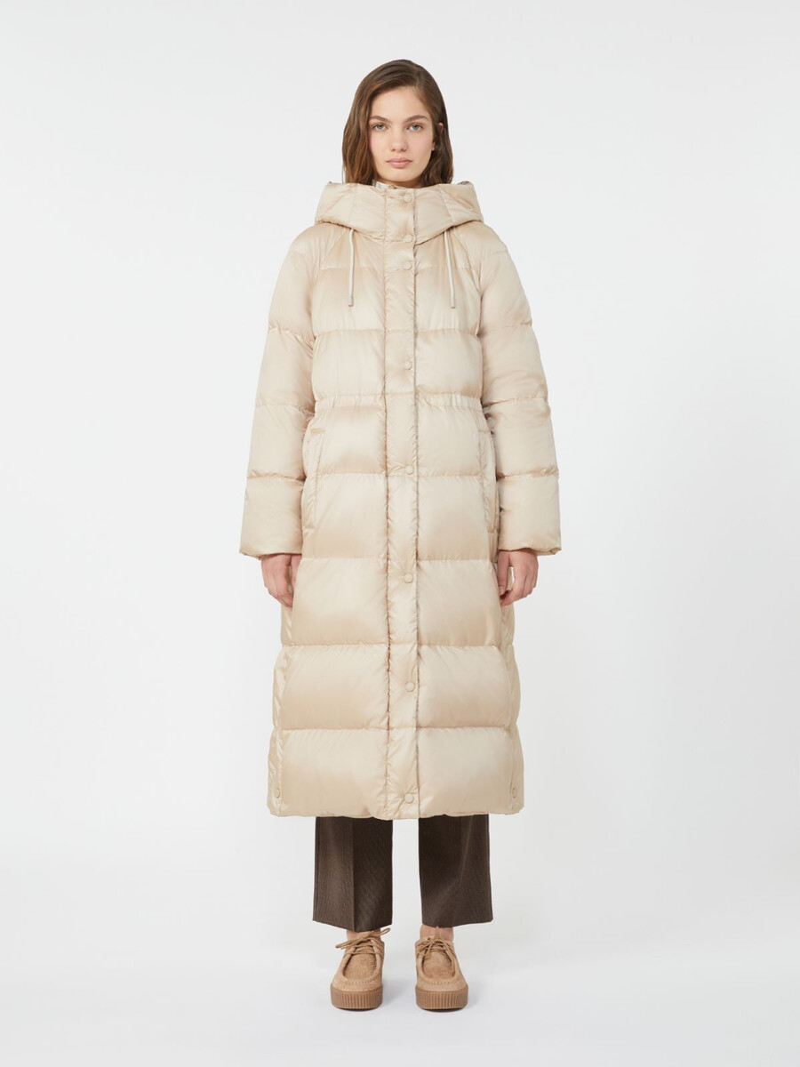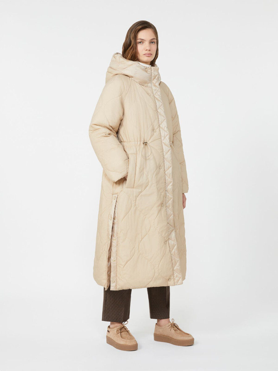 Piumino lungo reversibile con cappuccio con coulisse, maniche raglan e coulisse regolabile in vita.